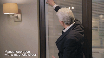 By the motor driver to control the lifting and turning of the blinds. The air layer width should more than 27mm, to have enough space to fit the motor.